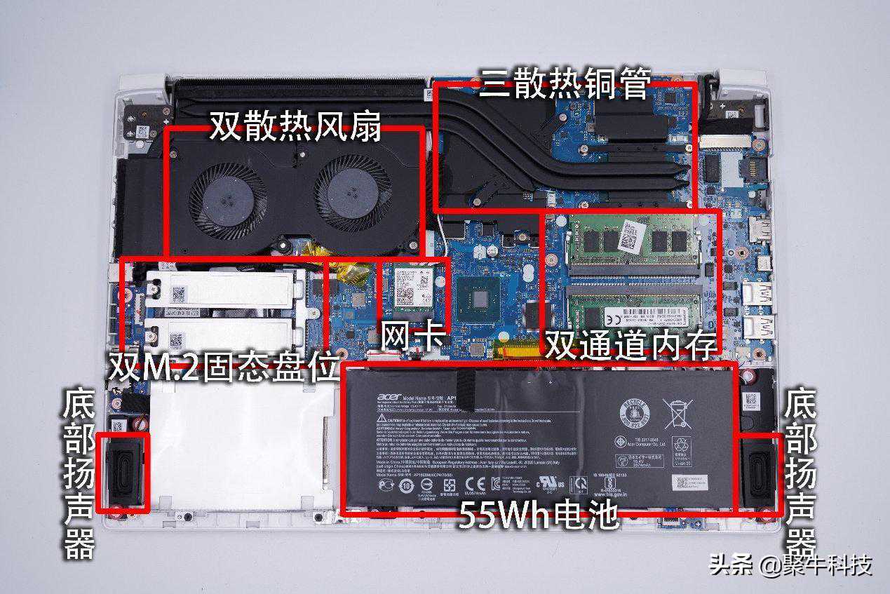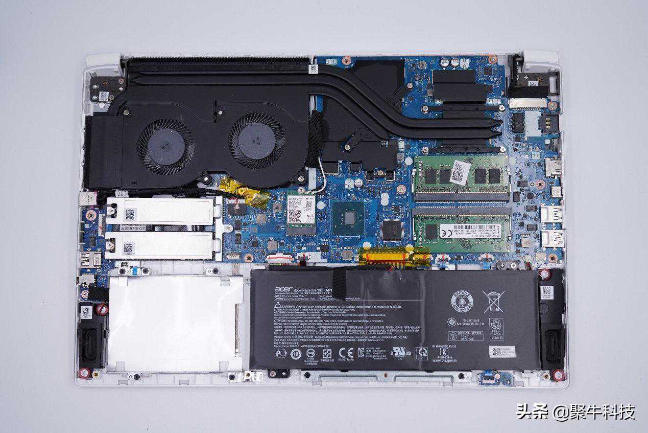 内部结构相对来说,ConceptD3还是比较干练的。主板以L型的布局横向摆放在机身内,双散热风扇则位于主板左上方单侧,CPU与显卡共享三根铜管散热。