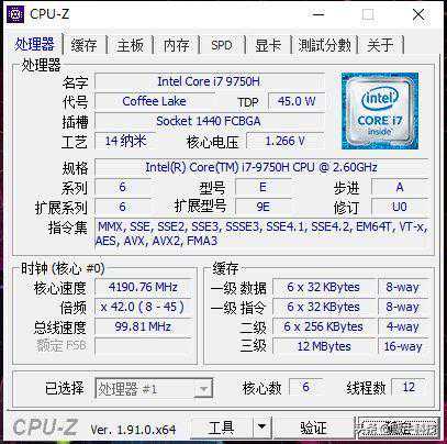 6核12线程的i7-9750H,隶属于Intel在2019年上市的全新第九代酷睿产品,采用14nm++工艺设计,L3缓存大小12MB。主频为2.6GHz,全核最大睿频可达到4.0GHz,而单核最大睿频则能达到4.5GHz,TDP为标压处理器标准的45W。