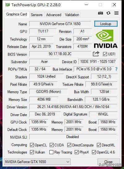 从GPU-Z所收集的信息来看,这块GTX1650独立显卡共1024颗流处理器、32个光栅单元、64个纹理单元,拥有4GB的GDDR5显存,显存位宽为128bit。频率方面,默频为1395MHz,Boost频率最高1560MHz,规格上比前代GTX1050Ti要强出许多。