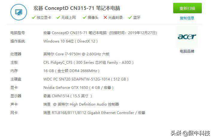 ConceptD3的硬件规格可以说是同类笔记本之中,较为出色的一类了。正如开篇所说,设计师所对于CPU的硬性需求,仅次于对屏幕的素质要求,而其所搭载的标压处理器Intel酷睿第九代i7-9750H则可以很好地满足这一点。
