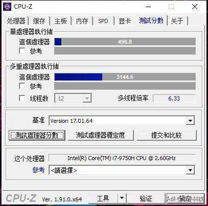 仅仅就CPU的理论性能来说,根据CPU-Z内置的Benchmark所给出的成绩,ConceptD3单线程性能496.8分,多线程性能3144.6分。