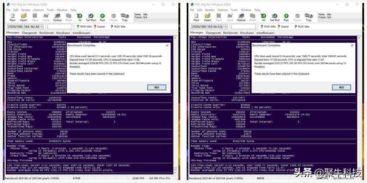 CPU进行的最后一项测试,绘制生成一张含有光线追踪效果的图像帧,以此来评判ConceptD3的计算能力。这里分别绘制一张关闭抗锯齿和打开抗锯齿的图像,分辨率统一设置为1920*1080,多线程渲染情况下用时仅为117秒,表现令人满意。