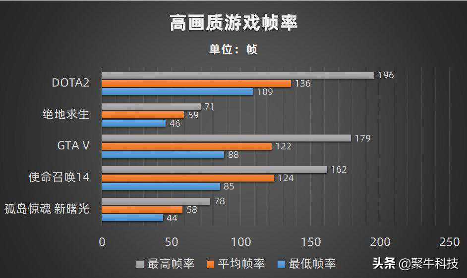 在实际的游戏体验过程中,随机挑选了目前比较火热的几款游戏大作。在确保了画质足够优秀的高画质模式下,《DOTA2》平均帧率136帧,《绝地求生》平均帧率59帧,《GTAV》平均帧率122帧,《使命召唤14》平均帧率124帧,《孤岛惊魂新曙光》平均帧率44帧。