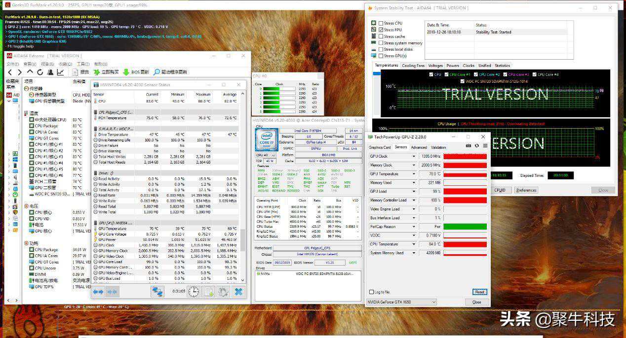 反观满载烤机状态,这里同时进行CPU浮点压力测试和Furmak显卡压力测试。在双烤30分钟后,CPU满载温度直达83度,功耗保持在35W左右,CPU主频稳定在2.3GHz左右;而显卡的满载温度70度,功耗保持在50W左右,GPU主频稳定在1.4GHz左右。