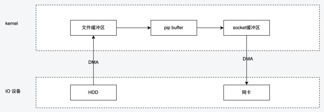 用户进程调用splice()从用户态陷入内核态,DMA控制器将数据从硬盘拷贝到内核缓冲区,从管道的写入端"拷贝"进管道,splice()返回,从内核态切换为用户态;