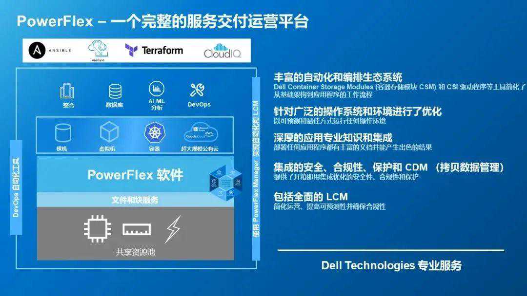 此外,PowerFlex还提供了一个功能丰富且开箱即用的工具集,其中包括PowerFlexRESTAPI、PowerFlexAnsibleModules和DellAppSync,以便自动执行DevOps、基础架构管理和DBA工作流。