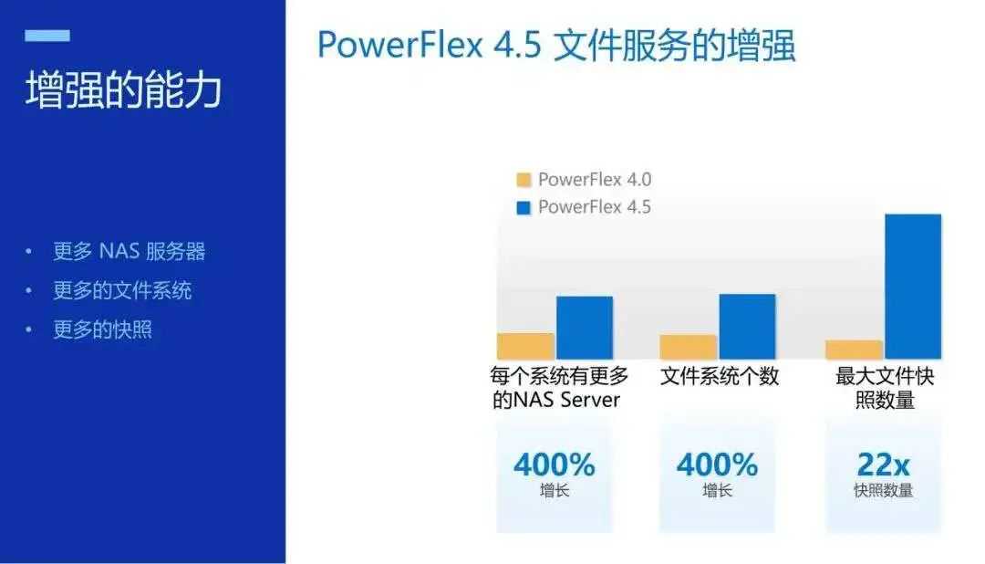 ●每个系统的NAS服务器文件服务器数量从512个增至2048个,增加了400%,并能够在单个系统中支持更多的NAS服务器。