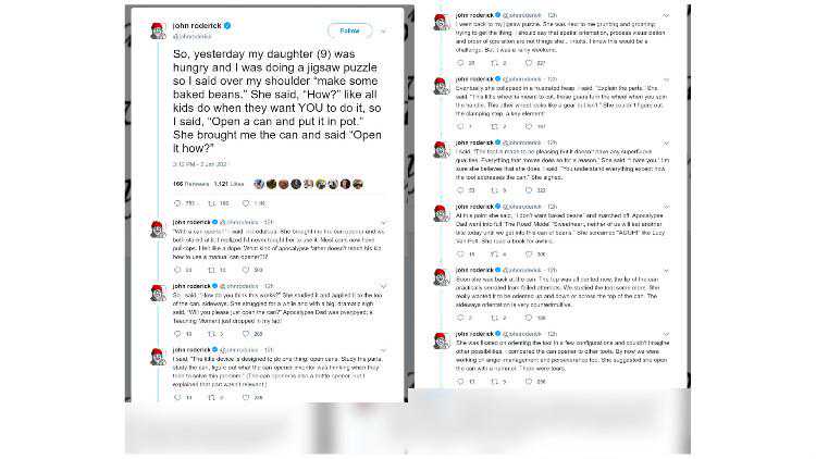 2021年1月2日,罗德里克连发23条“推文”,详细讲述了他如何不愿意陪女儿玩拼图,并“教导”自己饥饿的九岁女儿自己煮豆子,接下来的故事主要因其女儿无法打开一个豆子罐头展开。罗德里克最后在没有提供任何帮助的情况下花了“六个小时”(根据罗德里克个人推文)教他女儿如何使用开罐器。