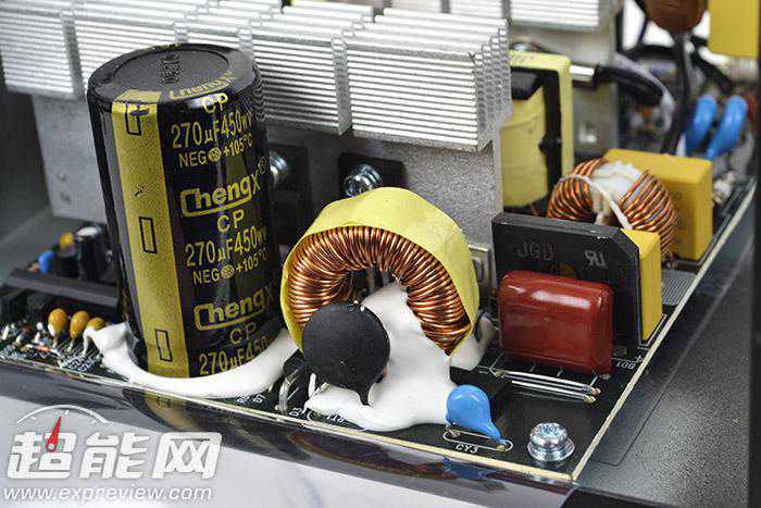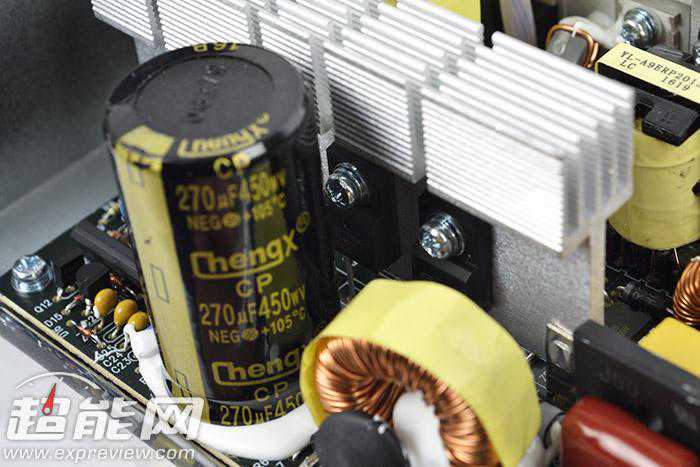 先马实力先锋500W电源使用的整流桥为800V/8A规格的GBU8K,没有配置散热片,主电容则是承兴的270μF/450V/105℃。