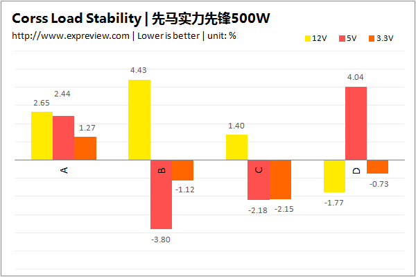 交叉负载的测试与前面的均匀负载测试的评判标准一致,电压偏离额定值越少越好,除-12V之外各路偏离率允许的值都为±5%。