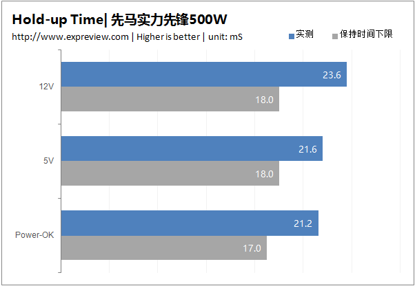 先马实力先锋500W的保持时间是在75%负载(DC输出375W)的情况下测得。