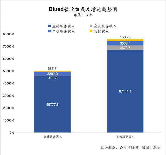 目前,蓝城兄弟的营收来自直播服务、会员服务、广告服务和其它四个部分。直播业务在2018年、2019年的收入分别为4.6亿元、6.7亿元,分别占总营收的91.3%、88.5%。