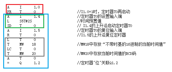 3、蓝框中的指令为STL中定时器的标准格式了。包括的定时器的启动、复位定时器"位"的关联等所有相关参数的设置。它与图1.2的逻辑功能完全相同。