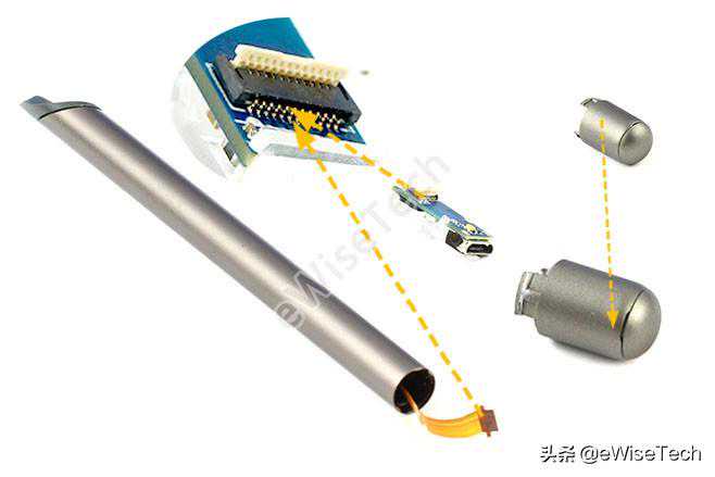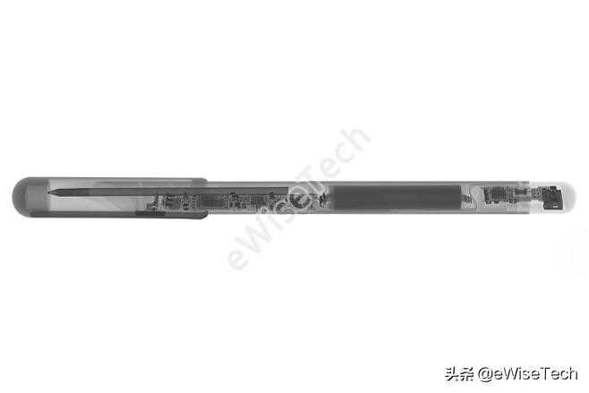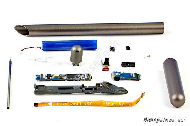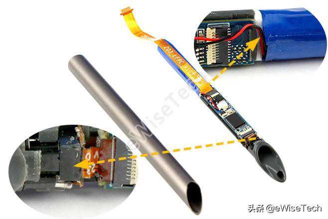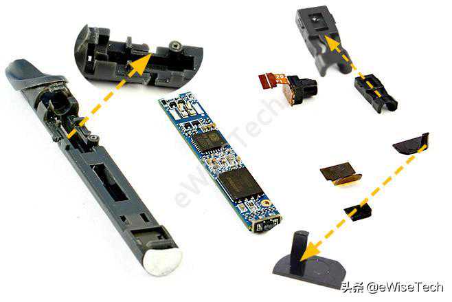 整支笔只在固定主板时使用了一颗螺丝,其他都是依靠塑料与笔杆进行卡位固定,电池为圆柱形电池,上下两端都贴有白色泡棉与两边的主板进行固定。主控芯片选用了定制芯片并采用了市面上比较少见的长方形封装形式,更有利于缩小PCB的宽度。主板和充电板通过一条FPC软排线进行连接,由于结构和PCB板大小的关系,拆解时需要从尾端也就是充电口这一侧进行拆解。高速摄像头通过主板盖的一些限位柱进行固定。整体下来没有一些多余的东西,结构牢固可靠。