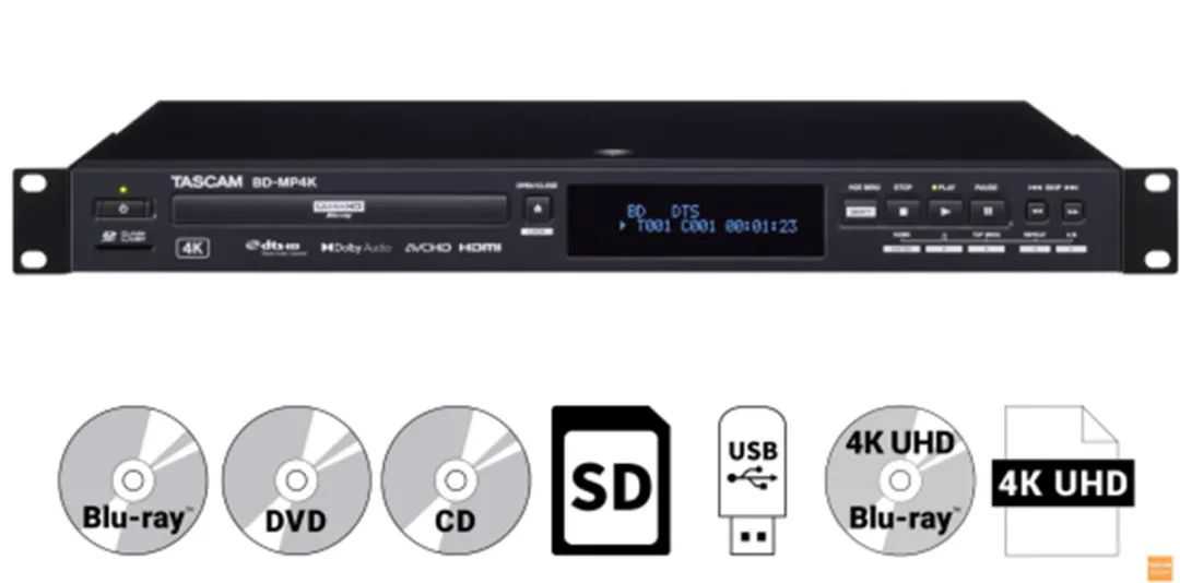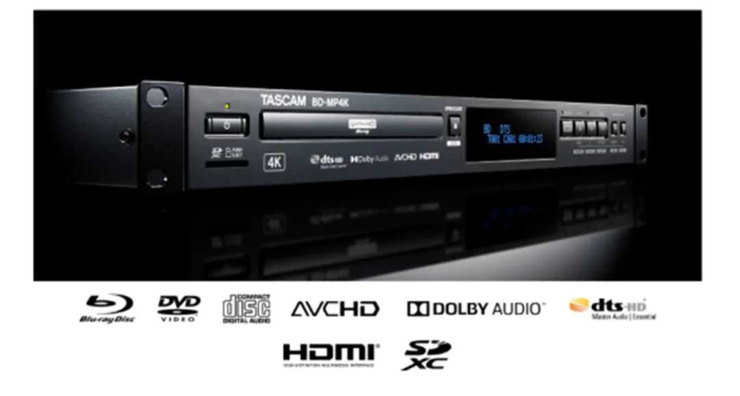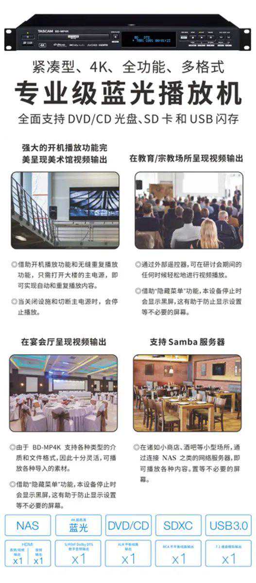 而TASCAM今日发布的BD-MP4K专业用4K蓝光/多媒体播放器,也是定位于专业水准的4K蓝光播放机,与我们厂家的家用蓝光机相比,这款TASCAM的产品不仅可对应机架安装,也可以播放规格对应4K影碟、蓝光、DVD及CD等,更能对应USB手指及NAS媒体档案播放。TASCAMBD-MP4K支持的媒体格式包括:ASF、MPG、AVI、MKV、MOV、M2TS等。其专业功能包括可隐藏操作选单功能及如遥控及托盘的操作以防范错误操作。