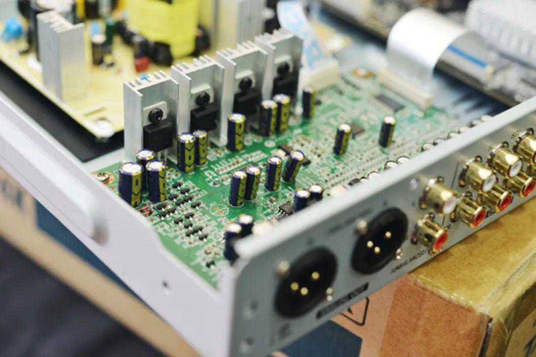 在打开外壳盖之后我们看到模拟7.1解码输出部分和数字部分严格分开,而且做工用料是相当的扎实,开关电源的用料和尺寸非常大。立体声输出的部分也有独立的D/A转换器,电源供电部分也有屏蔽磁环的设计保障电流的纯净。