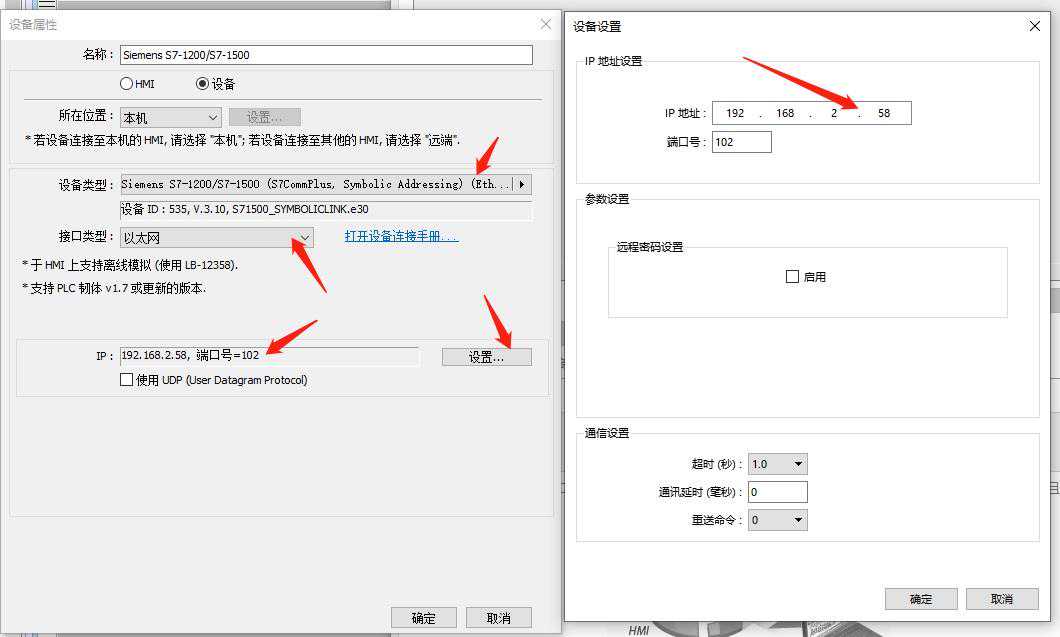 开启触摸屏程序,设备参数设置如下,必须主要触摸屏远程PLCIP设置为虚拟出的网卡的IP地址,本领为192.168.2.58;