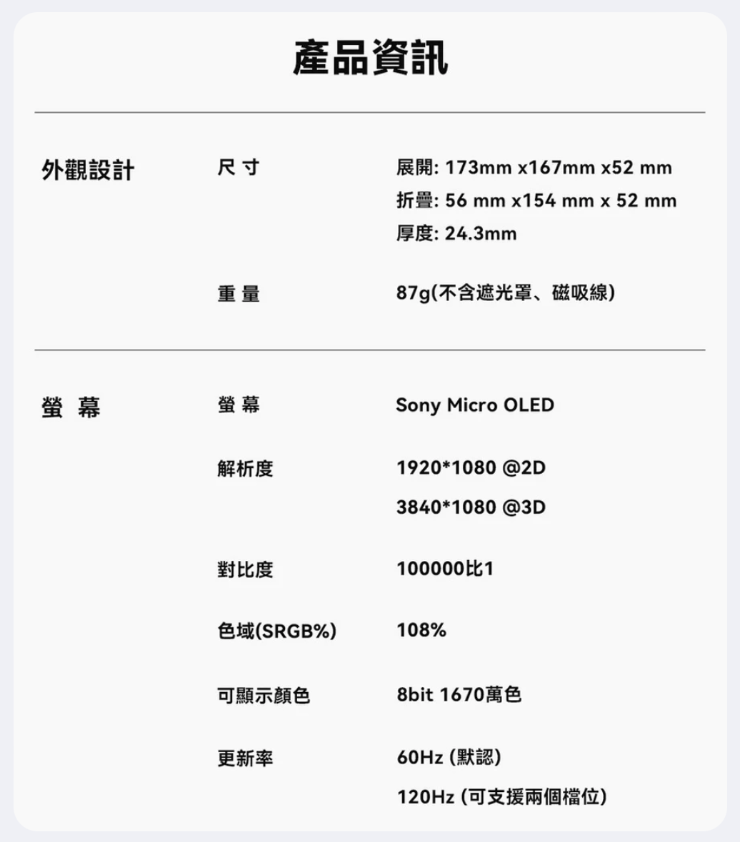 参数方面,这款AR眼镜配备索尼1080PMicro-OLED屏幕,覆盖108%色域,亮度相比上代提升至600尼特,刷新率提升至120Hz,重量87克,可以在距离用户6米的215英寸屏幕上显示1920x1080分辨率的内容。