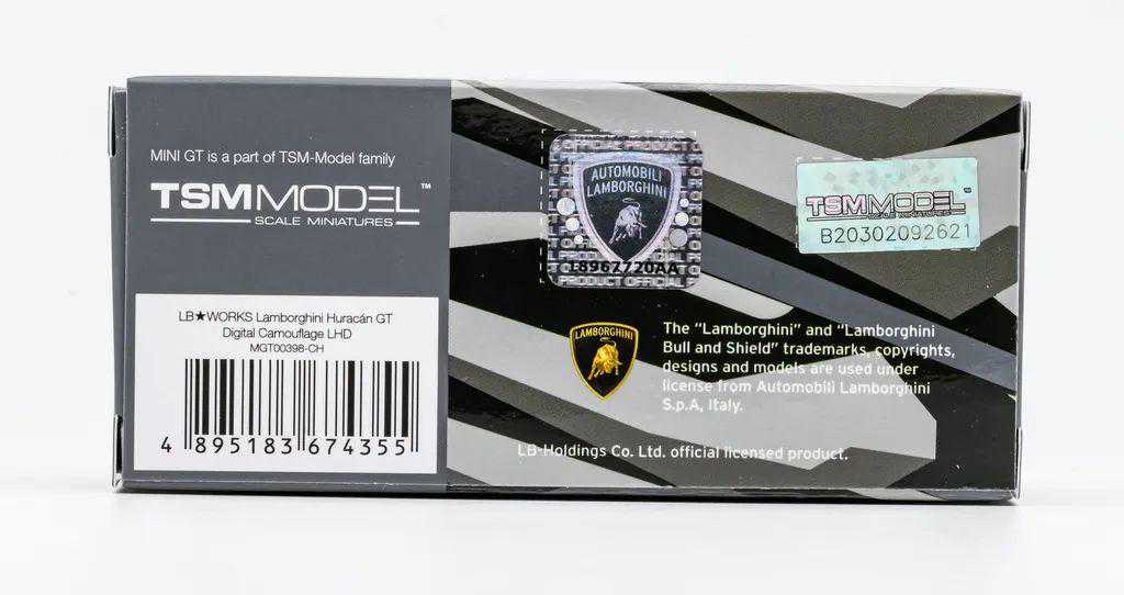 MiniGT的包装风格有点模仿TLV,纸盒的大小却建立起自己的标准;包装有手绘的模型图,呈现与车模一样的迷彩色,产品的编号398,产品有Lamborghini官方授权;模型包装内部是吸塑支撑,对模型的保护还算到位,值得一提的是,这又是一款中国经销商特别版。