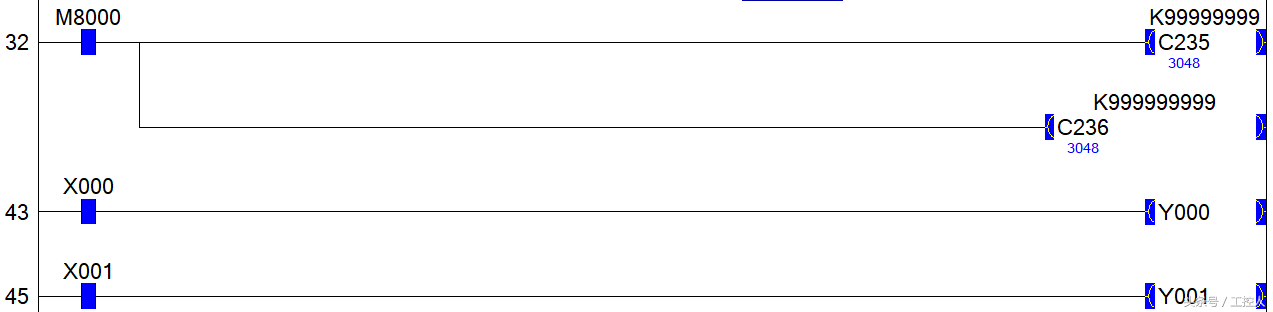 再来说说它是怎么计算脉冲的,一个圆形光栅盘均分成n个,旋转时,A和B从位置d0到d1,AB通输出一次就检测到一个脉冲,旋转一圈A和B的输出脉冲量是一样的,只不过检测时候谁前谁后的问题。这里我们在PLC程序中监控下编码器单相输出以及上述脉冲过程,采用欧姆龙E6B2-CWZ6C,A相接X0,B相接X1,采用高速单相计数器C235计A相输出,C236计B相输出:
