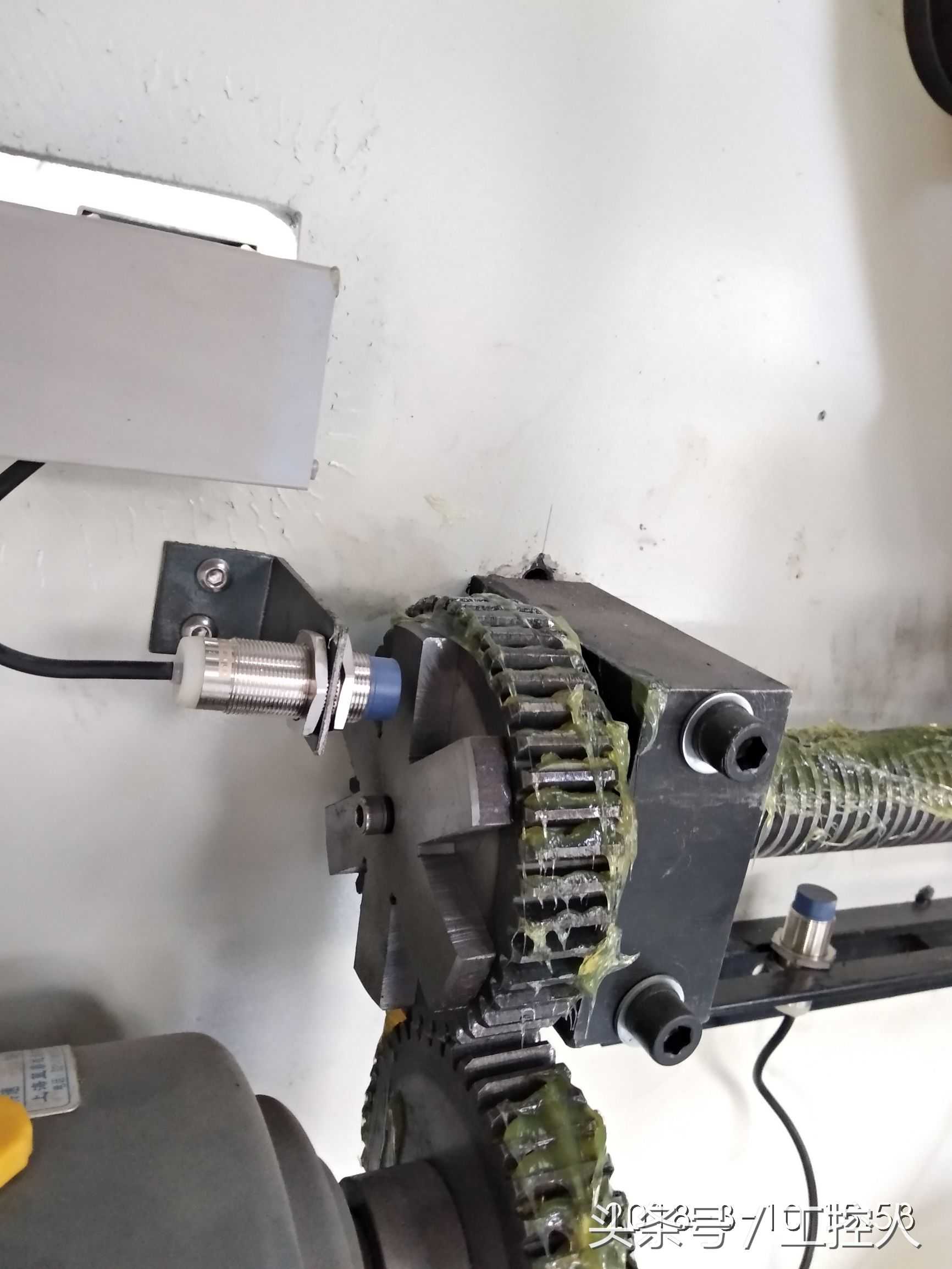 我们以下图来说明,电机带动6mm螺纹距的丝杆进行移动,把一个圆盘均分成6快齿轮似的,这样的话,电机每转一圈,接近开关会检测到6个信号,每个信号代表1mm,这样就实现了简单的定位功能。编码器与这个检测齿轮功能一样,也是检测信号的,只不过它的精度要比它高多了,这个齿轮是一圈6个脉冲信号,每个脉冲代表1mm,编码器2000P/R的就是一圈2000个脉冲信号,每个脉冲代表6/2000mm,伺服电机的编码器更高,例如17位的160000脉冲每转。