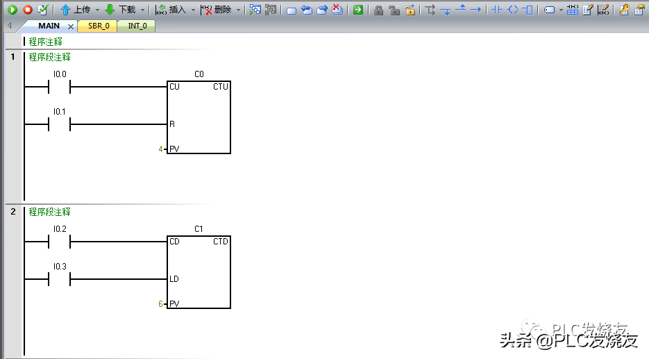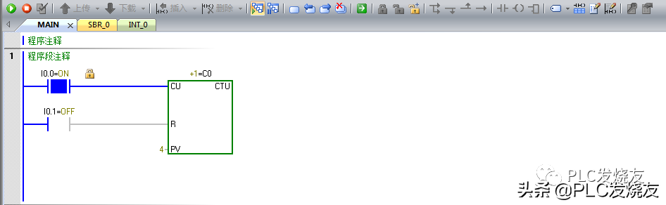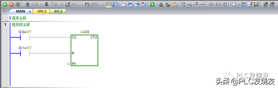 程序段1:CTU加计数(C0),CU使能端用常开触点触发,R复位也同样用常开触点,这里我们用来计数器复位,PV是设置值,这里设置4,也就是4次触发接通。