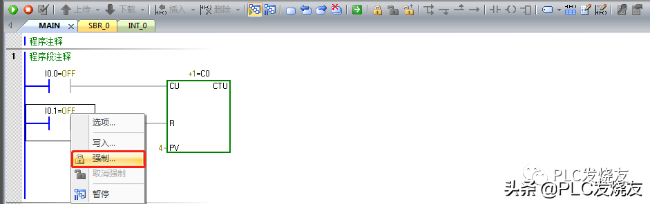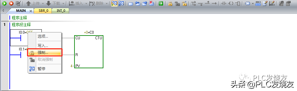 第五步:(鼠标选中常开触点右击进行强制,此时你会发现计数器归零复位了,然后取消强制,如果反复可以复位CO计数器)