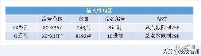 输入继电器在FX系列为8进制命名方式,而Q系列为16进制命名方式,所以FX系列没有X8,X9,而Q系列不但有X8,X9还有XA,XB因为采用16进制命名方式。
