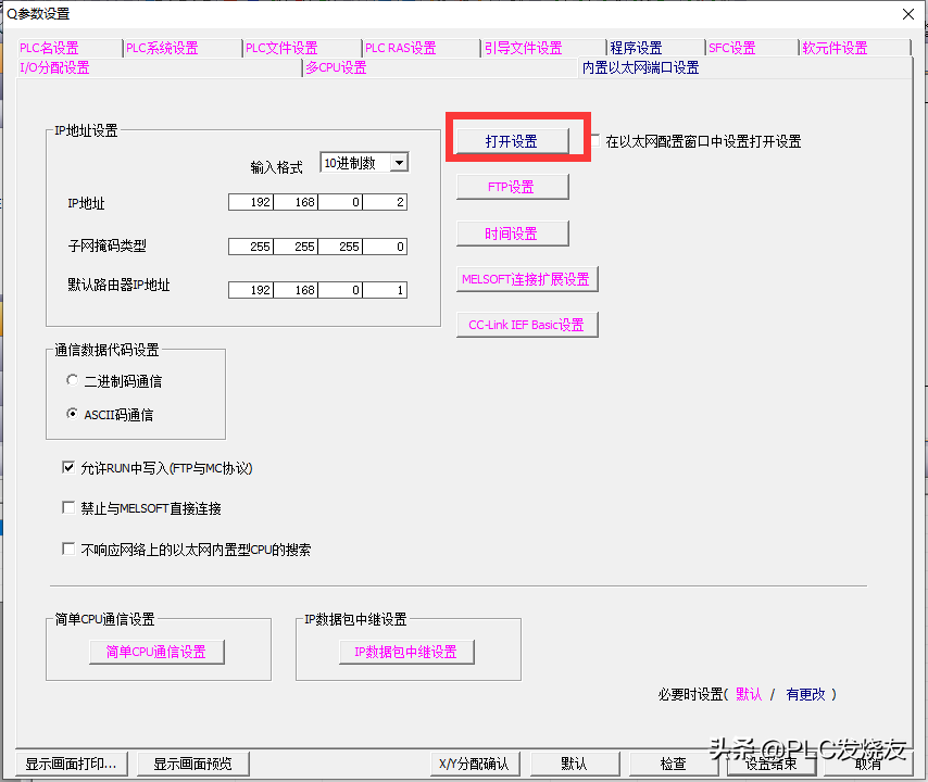 2:作为客户端,第一步要先做通道链接用指令,U0为Q系列内置以太网固定的写法。K1代表协议1,D100里面包含是否使用打开设置,在这里赋值0代表使用打开设置。