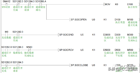 1:特殊软元件:(通道链接,网线接上后自动导通)、SD1282(通道打开完成信号)、SD1286(数据接收信号)、SD1284(通道请求打开)。这四个,如果是.0代表打开设置中的协议1;.1代表打开设置中的协议2.以此类推,总共16个协议。
