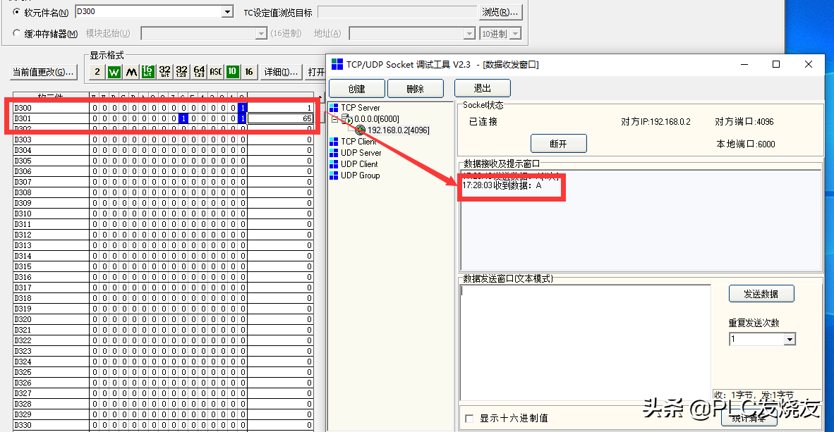 1:调试助手发送A,Q系列PLC接收65(A的ASCII码)