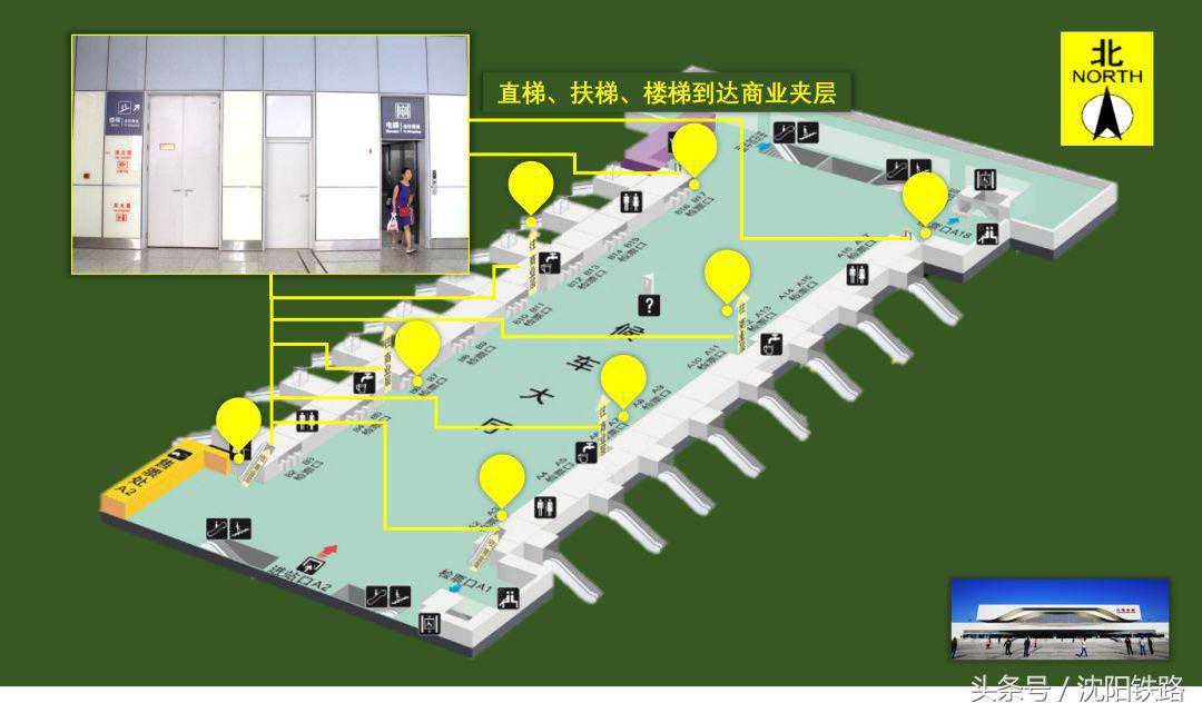 候车室A6、B6、A14、B14检票口附近设有直梯可以直达商业夹层,商业夹层提供旅行所需的各种购物和餐饮服务。