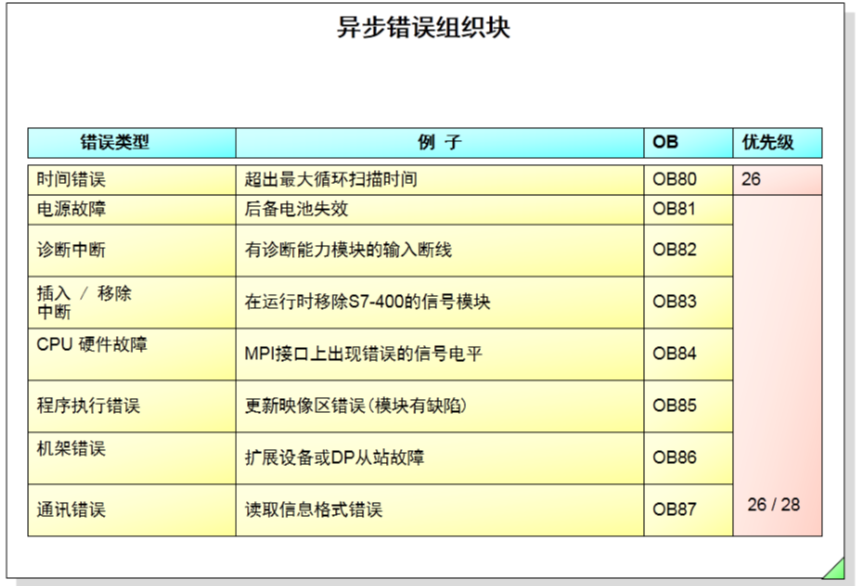•当前正在执行的OB为启动组织块时(优先级为27),异步错误的组织块的优先级为28。