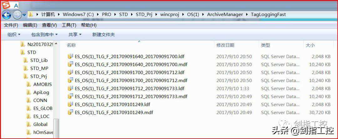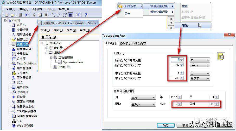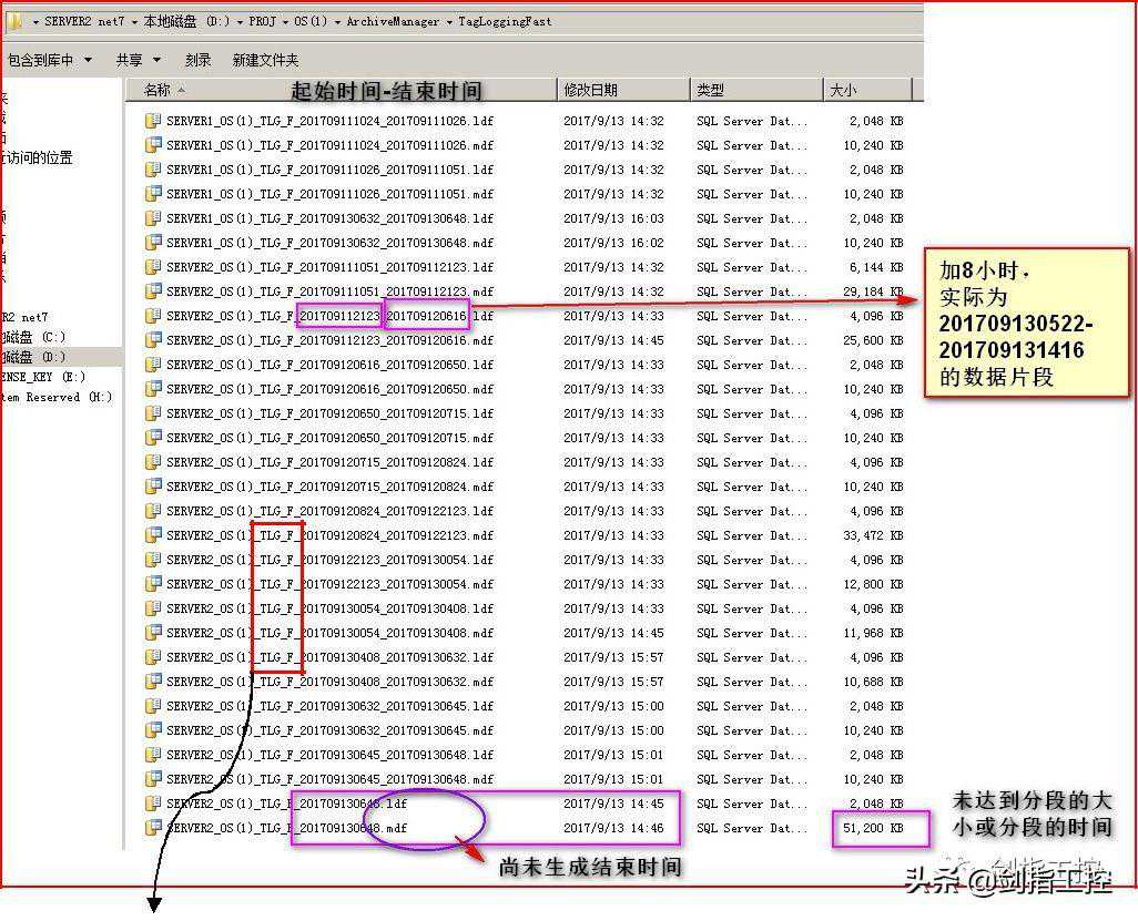 如下图,通过对“变量记录”的组态,当“更改分段的时间”或者“单个分段的最大尺寸”两个条件任意满足一个,就会生成一个快速归档的数据片段,文件格式的后缀是.mdf,后缀为.ldf的文件只是日志文件。且归档的文件在生成的时候会打上结束时间标志,为UTC世界时钟,与本机时间差8个小时。