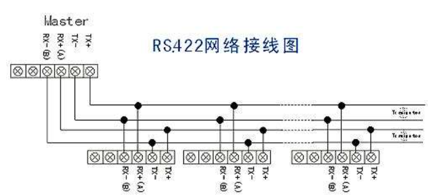 RS422是属于全双工,是在RS232的基础上把TXD分成了TXD+,TXD-,把RXD分成了RXD+,RXD-,是以差分信号方式发送和接受,不需要数字地线。(485也是一样),其通讯两端的接线方式如下图(4线)