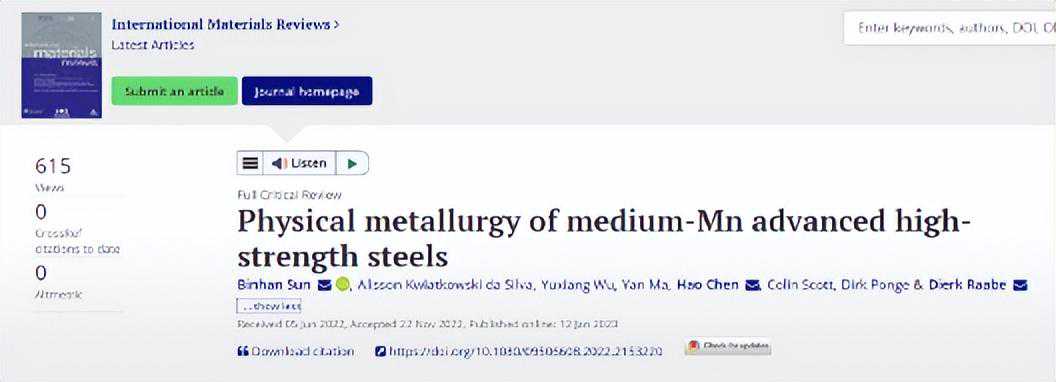德国马普所的DierkRaabe教授团队的这篇综述基于这些见解,各种可用的加工路线之间的相互作用,产生的微观组织和力学响应进行了严格的评估和合理化,并与其他高强度钢进行了系统的比较。该综述的目的不仅是为加速这类钢材的发展提供一个理论框架,而且还从学术和工业的角度强调了该领域的开放科学问题和挑战,这些问题和挑战需要未来的研究努力。相关研究成果以题Physicalmetallurgyofmedium-Mnadvancedhigh-strengthsteels发表在国际材料著名综述期刊InternationalMaterialsReviews上。