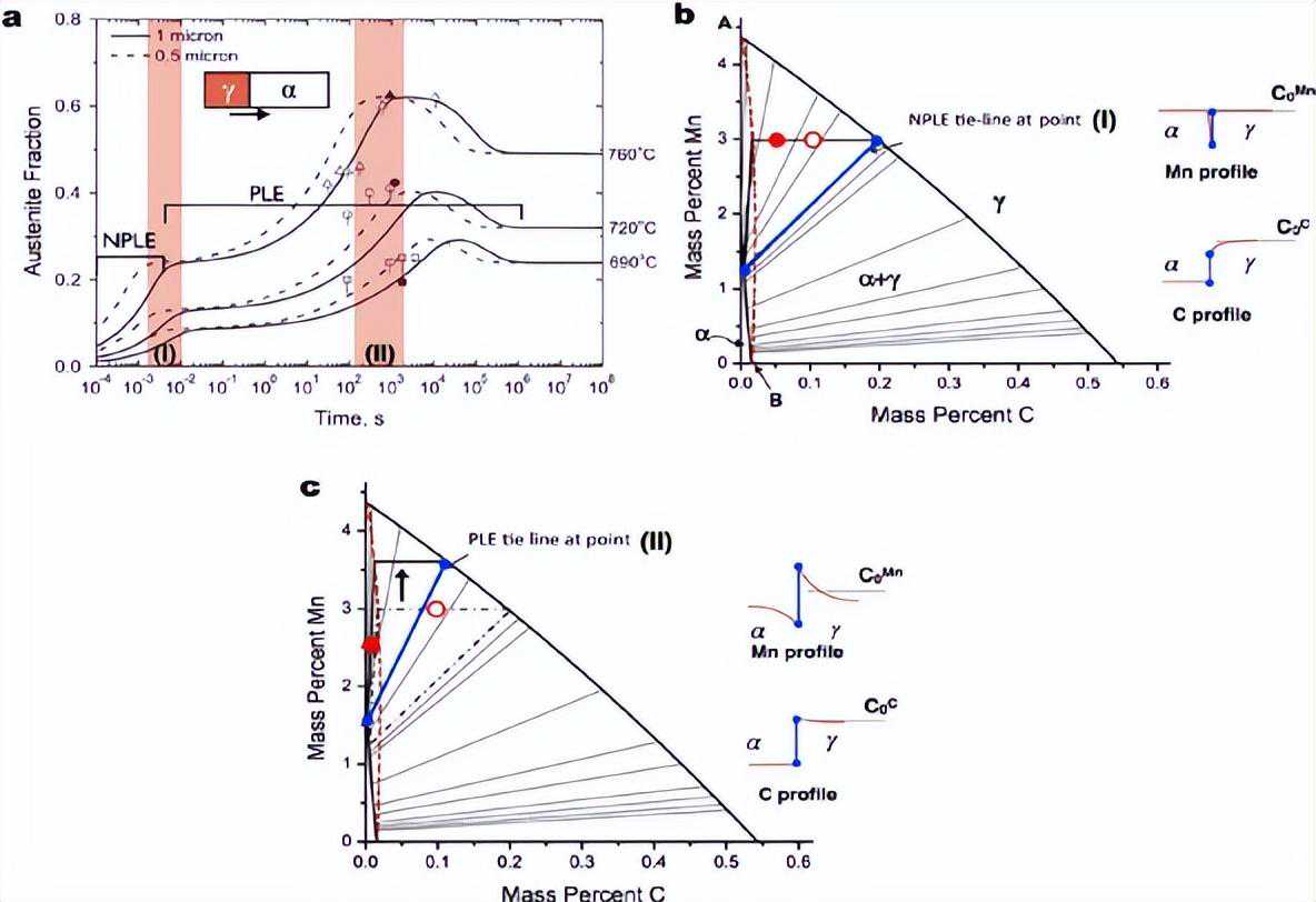 图2。(a)使用DICTRA模拟0.1(wt-%)钢,在不同温度下,从NPLE边界条件到PLE边界条件的不同生长阶段,奥氏体体积分数随时间的函数,如图所示(这里考虑了两个不同尺寸的模拟单元,0.5和1μm)。(b-d)基于Fe-C-Mn等温切片(开圈代表体成分,实圈代表现阶段铁素体的平均成分)界面联络线选择说明:(b)固定联络线的NPLE下生长;(c)奥氏体从NPLE向PLE生长过渡,连线向最大界面Mn含量方向移动。不同阶段的奥氏体/铁素体界面溶质分布示意图,突出显示了操作联络线。