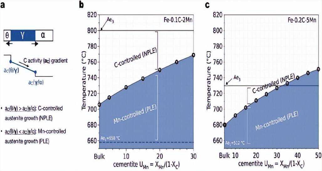 图3。(a)奥氏体(γ)从渗碳体(θ)/铁素体(α)界面生长的示意图。通过比较θ/γ界面和γ/α界面的C活性,可以确定奥氏体中是否存在正的C活性梯度,并导致C扩散控制的奥氏体生长;(b,c)绘制了c扩散控制奥氏体生长(NPLE)到Mn扩散控制奥氏体生长(PLE)之间的转变,作为临界退火温度和渗碳体Mnu分数的函数。这些热力学评估是为了比较钢成分(b)0.1C-2Mn和(c)0.2C-5Mn(wt-%)。Ae1和Ae3分别为平衡时奥氏体形成的起始温度和结束温度。