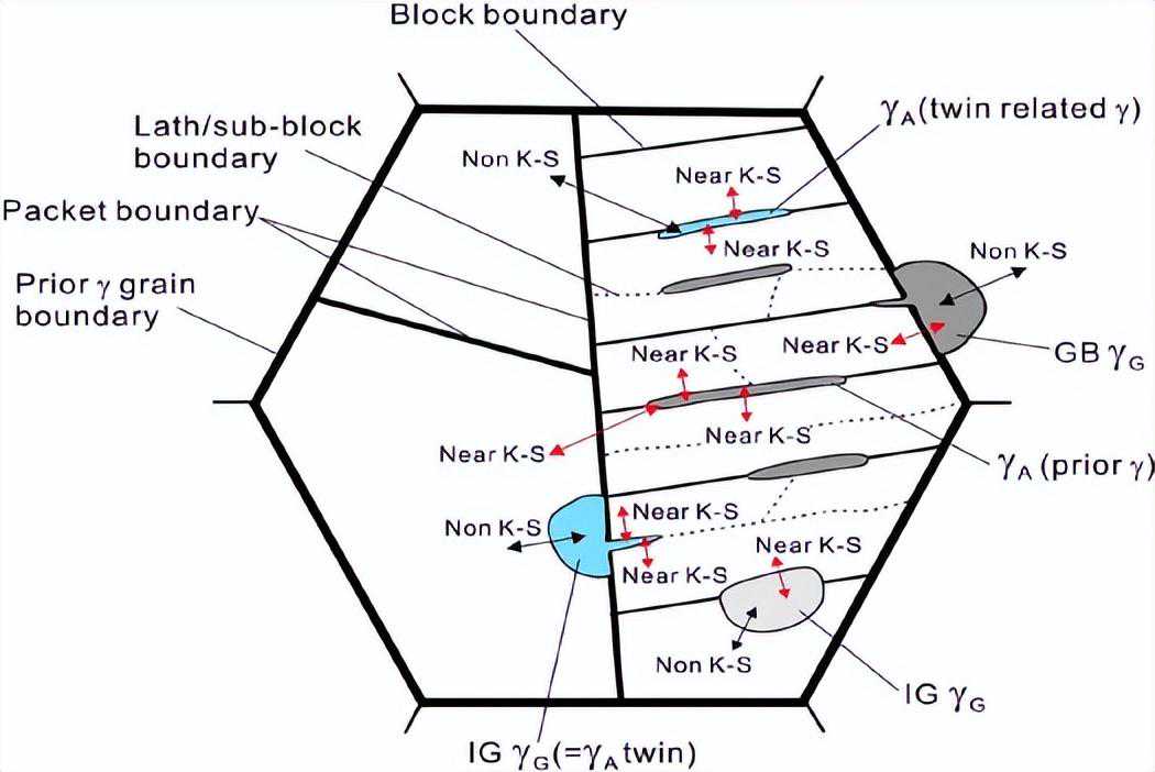 图4。板条马氏体中不同形核位置的奥氏体生长及与相邻相演变的OR和发展的奥氏体形态的示意图,其中GBγG代表球状形态的晶界(GB)奥氏体,IGγG/γA代表球状/针状形态的晶内(IG)奥氏体。