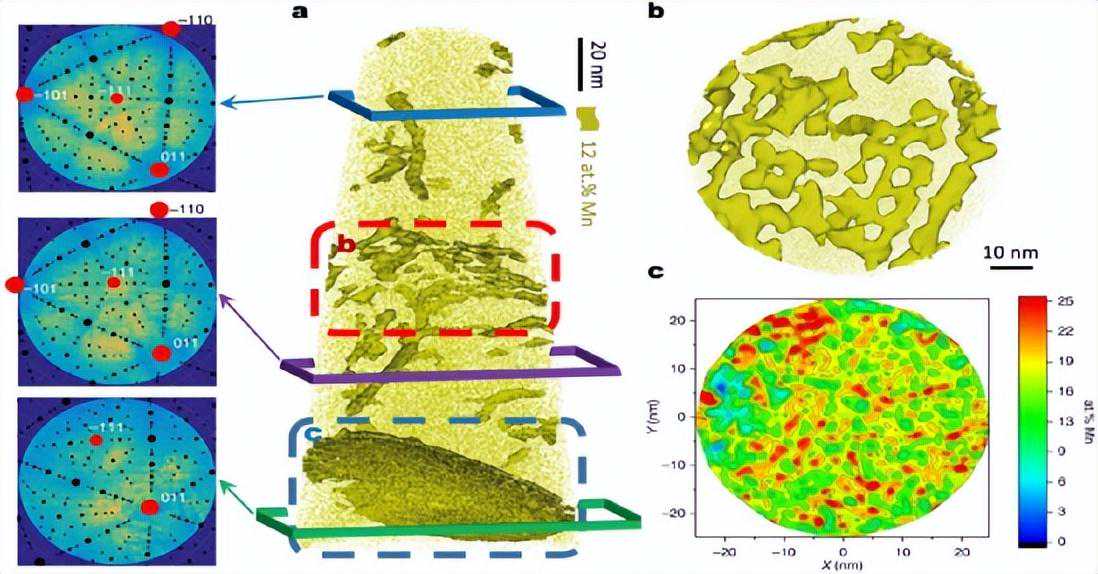 图6。450℃Mn修饰6h后晶界的APT分析(a)12.5at-%Mn等浓度表面(选择12.5at-%Mn作为阈值,以突出Mn富集区域)。分别用蓝色、紫色和绿色框标记的区域的探测器图。在地图主极(红点)识别后,叠加相应的立体投影(黑点)。(b)(a)中红色虚线框所示的等浓度表面所显示的扭曲低角度晶界细节。(a)中蓝色虚线框突出显示的晶界通过晶界平面内的面内浓度分析导出并显示在(c)中。
