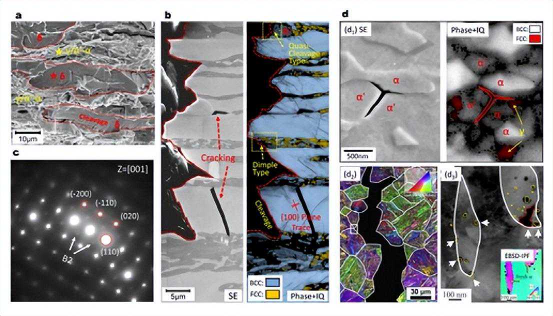 图8。(a)含粗粒δ-铁素体(δ-铁素体中Al和Si含量分别为~4和~3.5wt-%)的高Al、高Si添加MMnS(0.2C-10Mn-3Al-3Si,wt-%)的典型断裂表面和(b)开裂行为。(c)同一样品中δ-铁素体的选择区衍射图;(d)报道了MMnS中h诱导的损伤行为:d1,在0.2C-10Mn-3Al-1Si(inwt-%)两相钢中观察到h诱导的沿铁素体和应变诱导的α′-马氏体界面和母奥氏体晶界的沿晶开裂;d2,h诱导沿PAGB开裂,在含有层状奥氏体-铁素体组织的0.1(inwt-%)热轧退火钢中观察到;在中mn马氏体时效钢(0.01,wt-%)中观察到的铁素体应变诱导α′-马氏体界面和新鲜马氏体内部h诱导的纳米空洞。