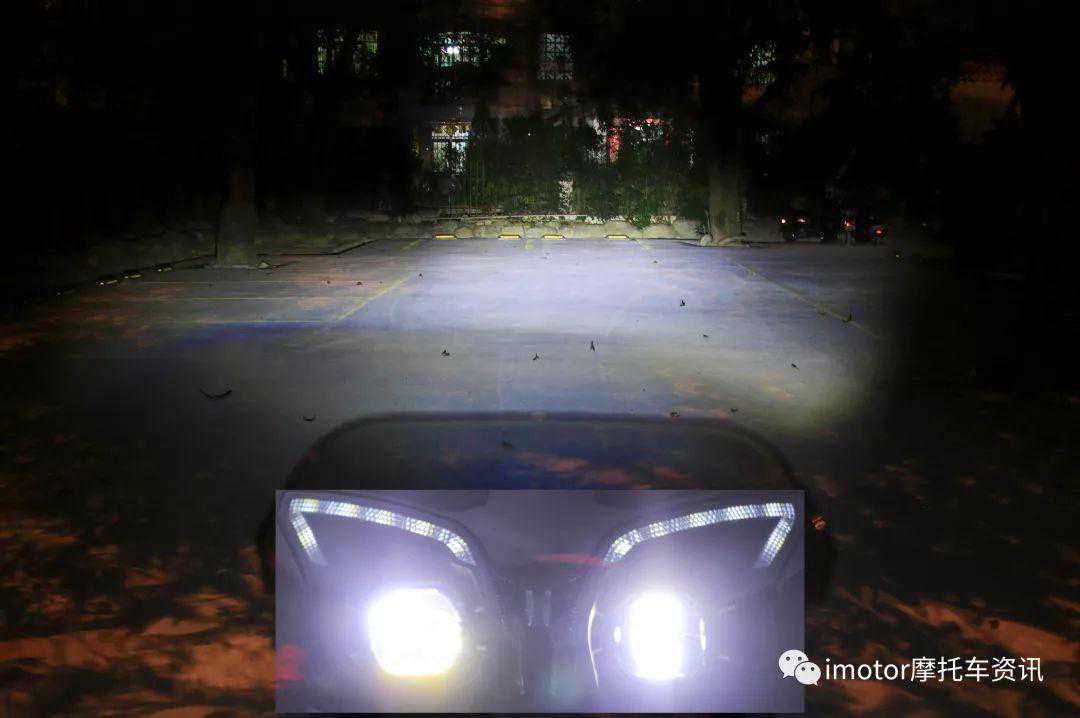 LED远光灯的夜晚实际照明效果,远近光同时开启后在近光灯原照射范围的基础上,远光的投射点集中明亮。TRK251的大灯照明效果满足城市通勤的正常使用,只是色温偏白的LED灯源在雨雾天的穿透力一般,喜欢长途骑乘的车主建议后期改装雾灯。