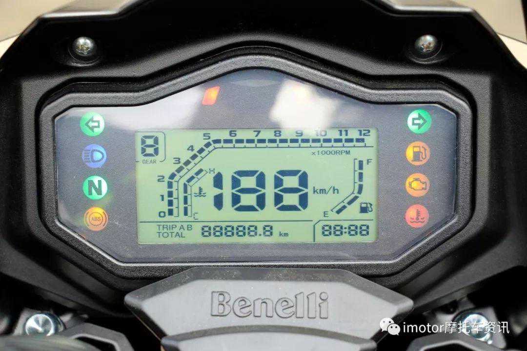 TRK251的仪表位于小风挡的下方,仪表外形采用不规则的形状,仪表外圈左侧是左转向灯、远光灯、空档指示灯、ABS指示灯。右侧是右转向灯、燃油警示灯、发动机警示灯、水温警示灯。中间上方是换挡指示灯。