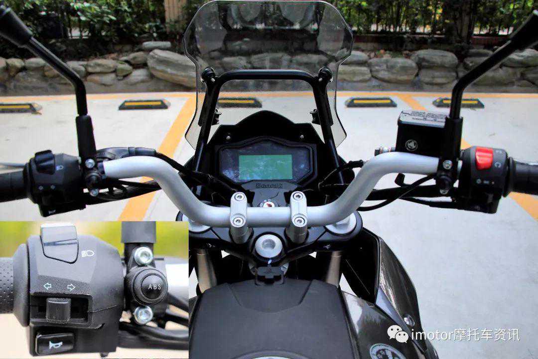 TRK251采用加高的一体式宽把,左右的把手按键常规布置非常容易上手,只是没有双闪开关是个遗憾,这对长途骑乘挺重要的。此外还配置有超车灯,仪表的按键分别独立配置在左右把手两侧,左侧是ABS开关按钮,右侧是仪表显示功能切换按钮。