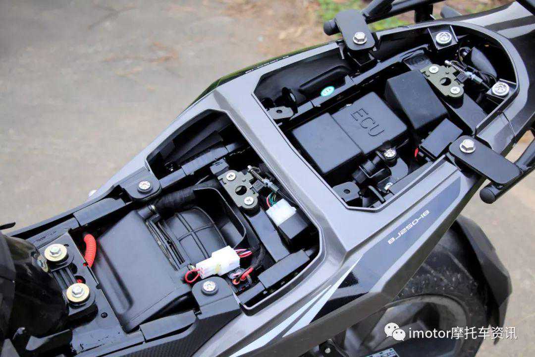 坐垫下的空间布置有车辆电池和行车电脑ECU,之外空间局促也并没有放置随车工具,想增加储物空间的话还是购置油箱包或者尾箱吧。