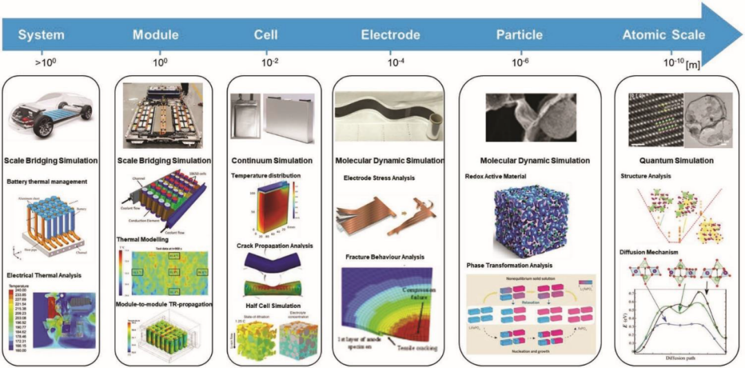 宏观尺度上电池模组、电池包及系统的仿真模拟发展相对成熟,下文中我们重点探讨微观尺度和介观颗粒尺度以及电芯尺度上的前沿进展。