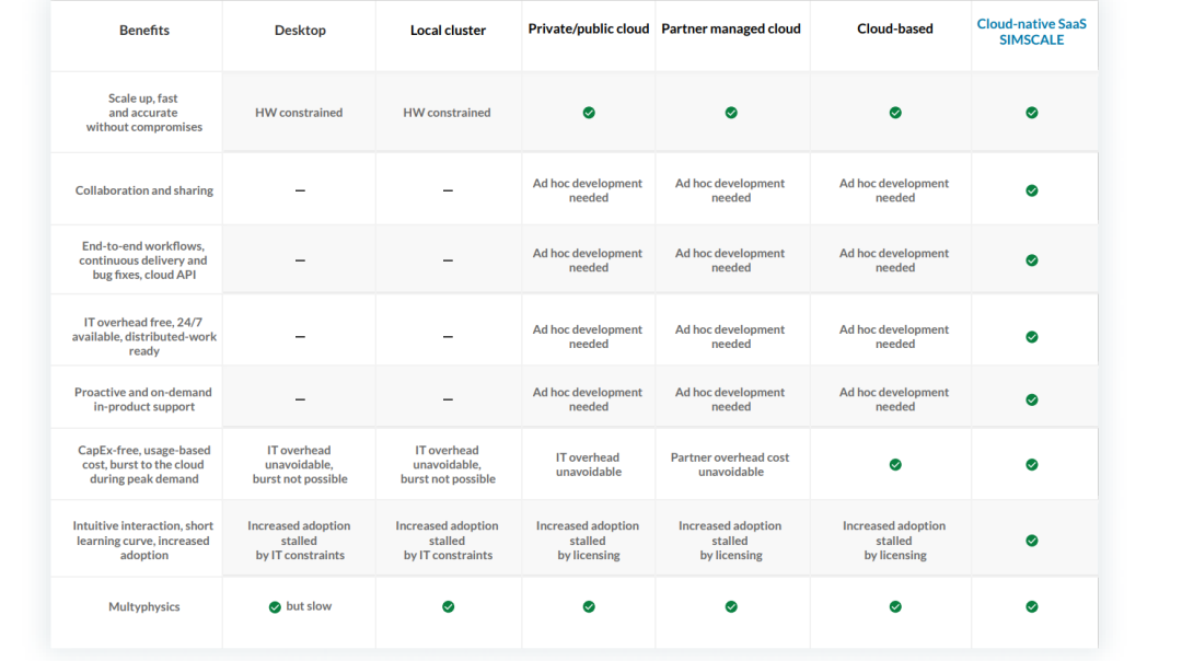 国外云端CAE软件公司有Simscale、Onscale、Designworld、Caeplex、Ceetron等,以Simscale为例,其采用SaaS模式进行交付。Simscale希望通过SaaS交付来为用户进一步节省下IT资源的部署投入,为工程师提供另一条更低成本的选择,而不是只能高价购买仿真软件的license。Simscale可以进行多物理场仿真,覆盖结构、热、流体等领域。但是,Simscale的求解器模块采用开源的OpenFOAM和CalculiX,OpenFOAM用于流体仿真,而CalculiX用于结构力学仿真,这意味着Simscale的仿真求解功能有限,只能解决一些基本问题,无法向高端市场跃进[33]。下图为Simscale与其他部署类型仿真软件之间的对比。