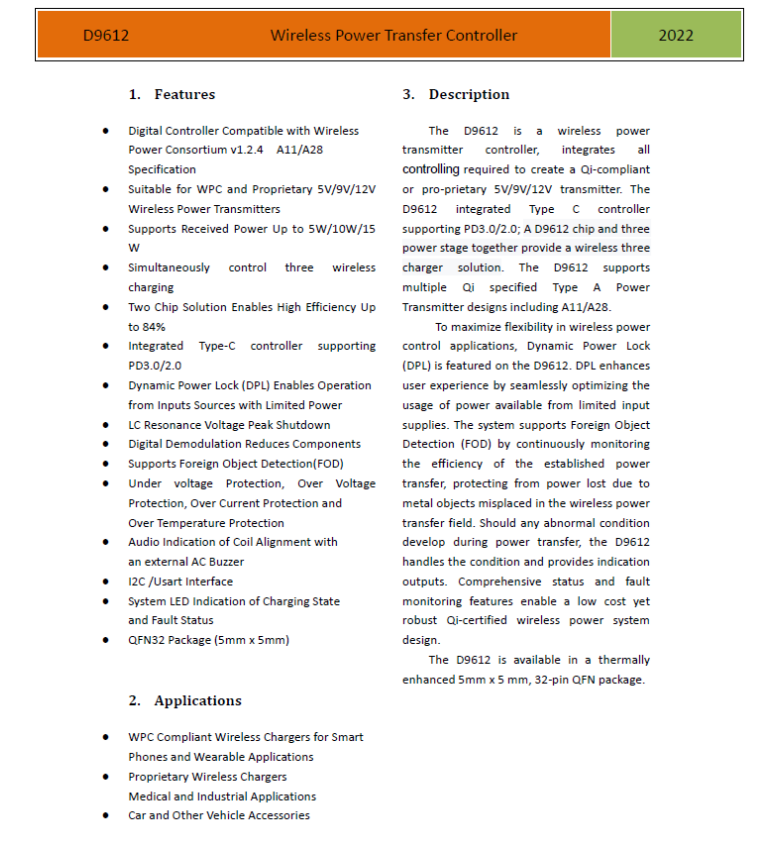 此外,片内还集成全桥驱动电路和电压电流两路ASK通讯解调模块,集成度高,降低方案尺寸和BOM成本。应用产品包括:背夹、无线充电底座;车载无线充电设备等。