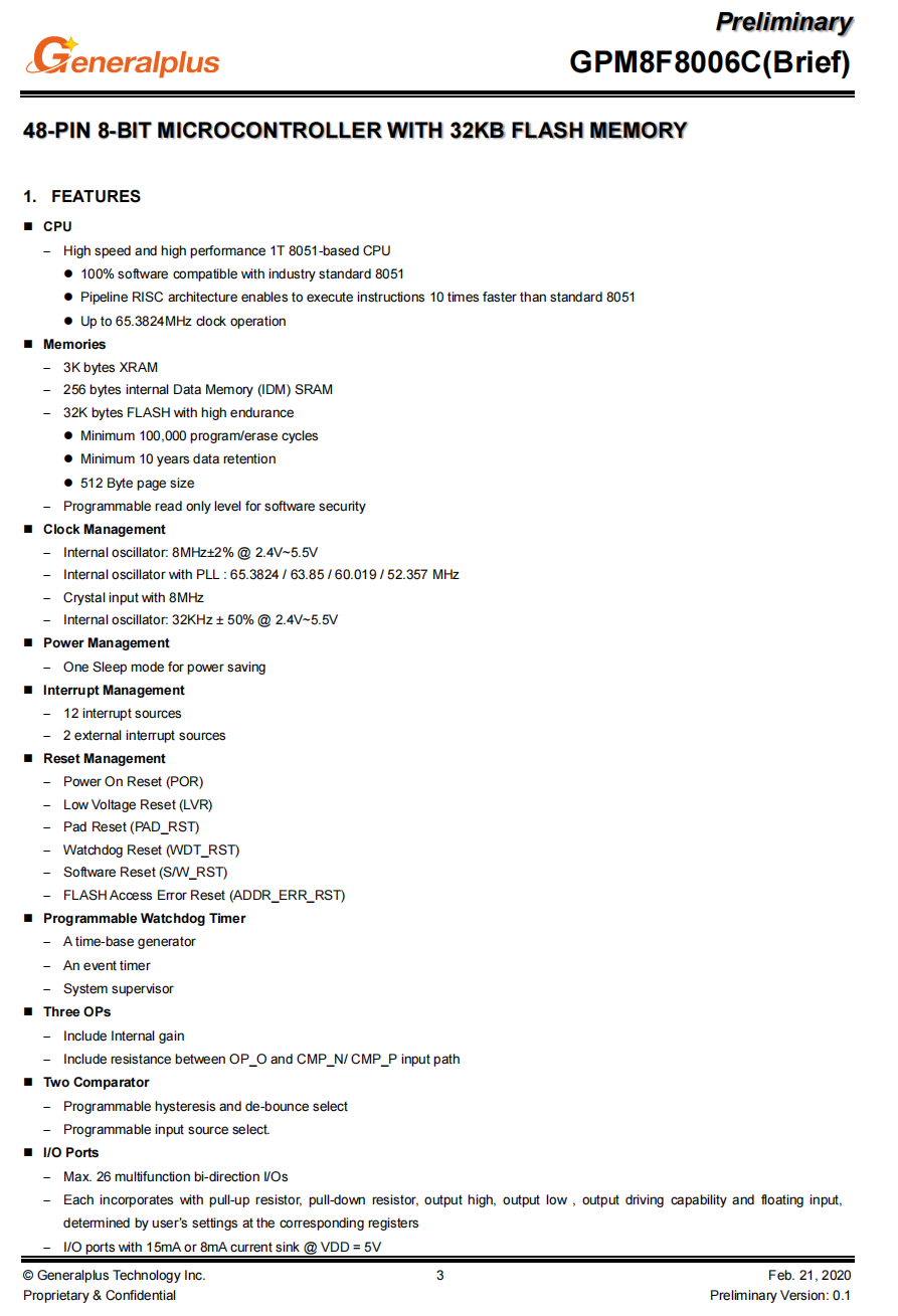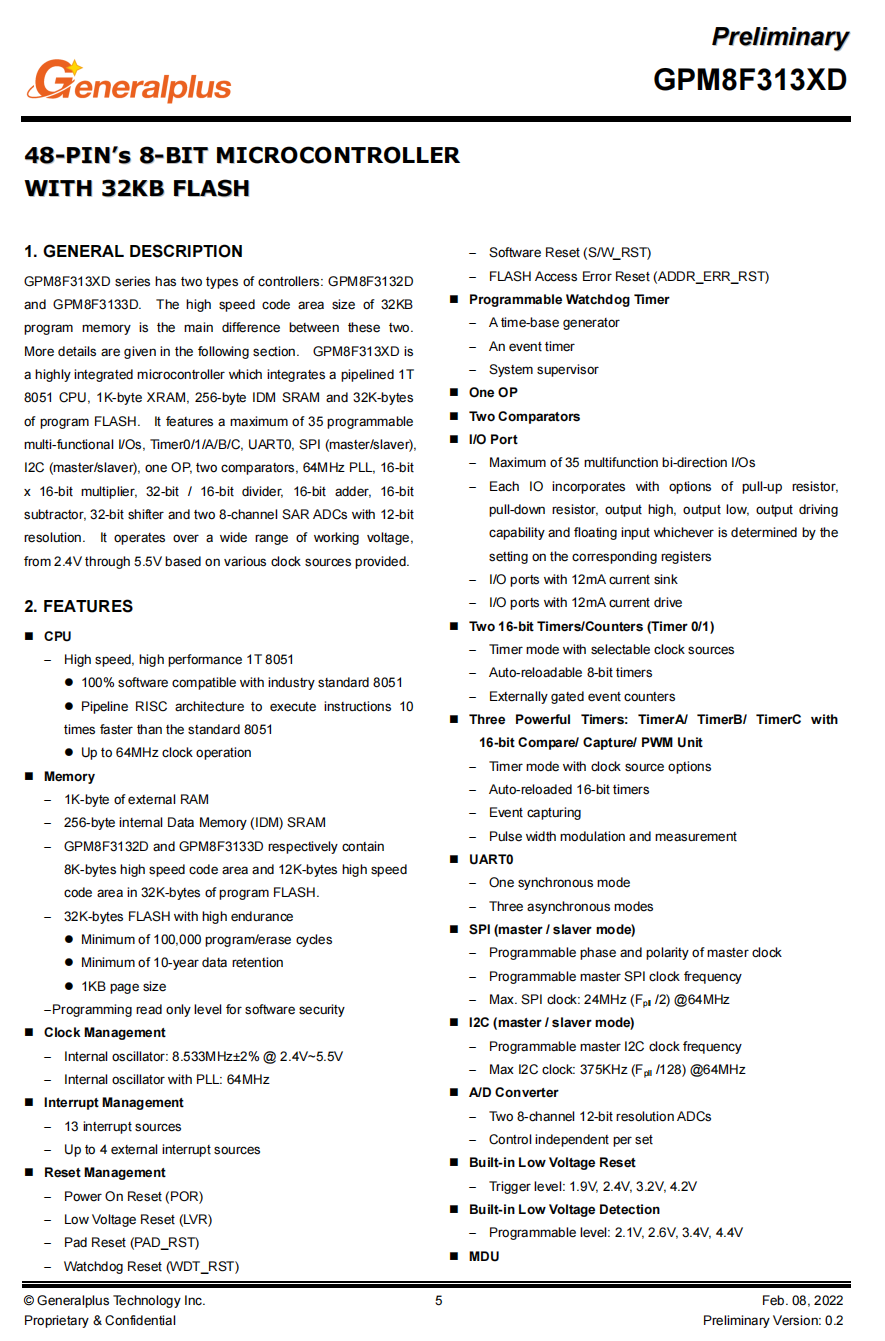 通信方面,该芯片具备丰富的通信接口,包括UART、SPI、和I2C,以及强大的13通道12位分辨率ADC。这使其成为适用于广泛应用领域的理想选择,包括物联网、嵌入式系统和自动化控制等。总体而言,GPM8F8006C芯片凭借其功能丰富、性能卓越以及灵活性,成为开发者首选的解决方案之一。