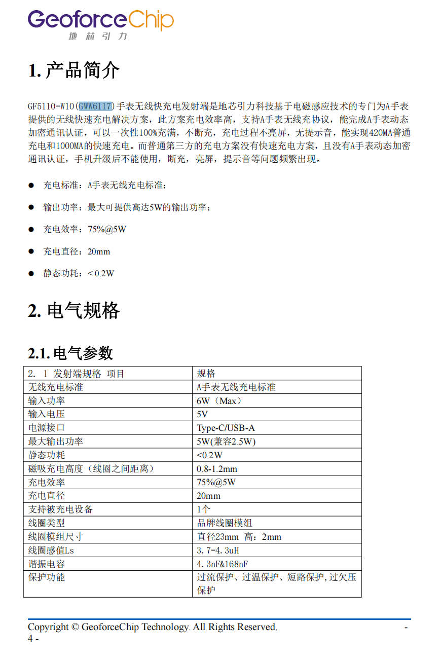 地芯引力GWW6117GF5110-W10(GWW6117)手表无线快充电发射端是地芯引力科技基于电磁感应技术的专门为手表提供的无线快速充电解决方案。